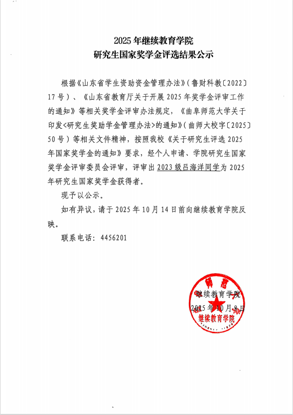 2025年继续教育学院研究生国家奖学金评选结果公示