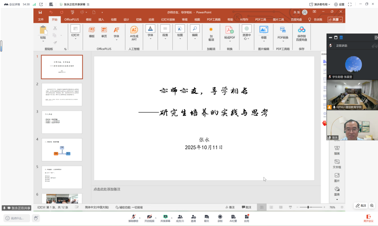 10月11日晚,我院邀请华东师范大学教育学部职业教育与成人教育研究所副所长、博士生导师张永教授线上作了题为《亦师亦友,导学相长——研究生培养的实践与思考》学术讲座,会议由何爱霞教授主持。